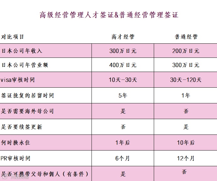 高级经营管理人才签证一年即可申请永住,而普通经营管理签证要十年时间,并且高级人才(高度専門職)是入管局规定优先审批的签证,VISA和PR的审核时间都是最快速的。