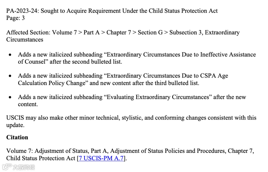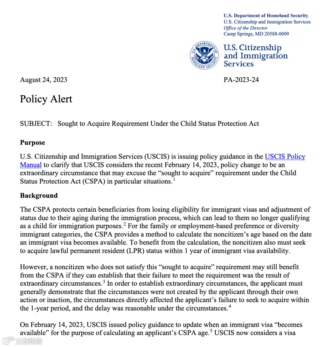 当地时间8月24日,美国移民局再次做出了相应地调整,将此前的表B锁龄新政设定为特殊情况,在该特殊情况下可以豁免那些因为政策变动而未来得及在一年内递交I-485申请,完成“seek to acquire”动作的子女。