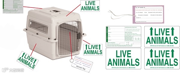 将”Live Animal”的标示贴在笼子上明显的地方。因为把宠物交给航空公司之后,就只有空勤及地勤人员可以接触宠物。因此”Live Animal”的标示可以提醒搬运行李货物的工作人员小心搬运,并将其摆置于通风安全的地方。万一运送过程中不小心让宠物跑出来,贴纸上宠物的特征信息及相片可以帮助找回宠物,以通知饲主或是继续完成旅程。