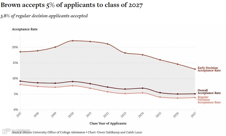 布朗大学共收到51,302份申请,是有史以来申请人数最多的一年,整体录取率为5.08%,为历史第二低。