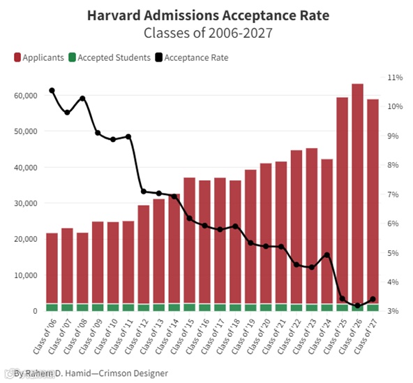 今年哈佛大学的整体录取率来到3.41%,创历史第二低纪录,仅次于去年的3.19%。