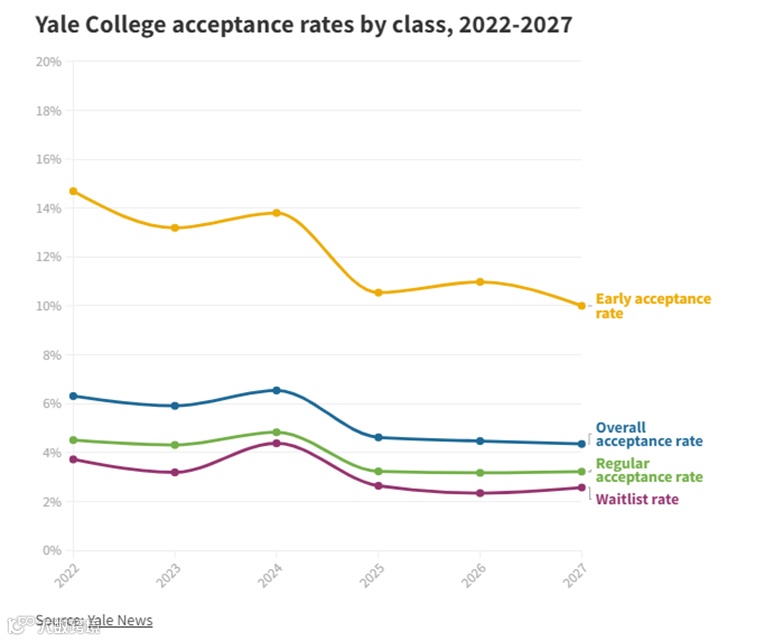 耶鲁大学今年共收到了52,250份申请,是史上申请人数最多的一年,而仅有2,275名学生被录取,录取率为4.35%。