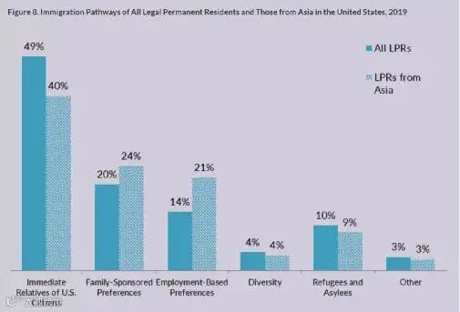 在2019财年获得美国合法永久居留权(绿卡)的超过100万人中,约有364,800人(35%)来自亚洲。与所有新的合法永久居民相比,亚洲人更有可能通过基于就业的优先级别移民签证(分别为21%和14%)获得绿卡。
