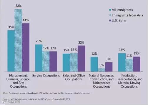 亚裔移民中超过一半(53%)受雇于管理、商业、科学和艺术职业,所占比例远高于外国和美国出生的总体人口。
