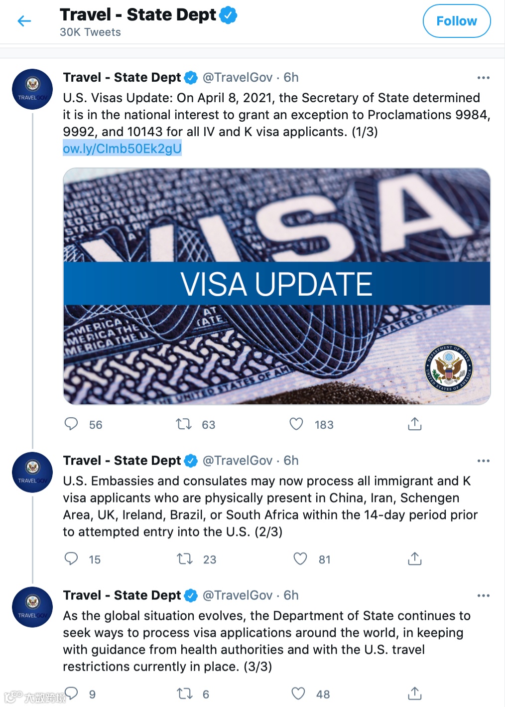 而且根据美国国务院官方推特@TravelGov发表的三条推文显示:即日起因为疫情影响而颁布旅行禁令的国家,包括中国大陆、伊朗、欧洲申根区,英国、爱尔兰、南非和巴西将开始发放移民签证以及配偶K签证。