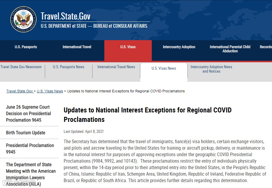 4月8日,美国国务院发布公告称,将移民签证和配偶签证以及部分访问学者签证等列为国家利益例外之列,不再受2020年川普颁布的旅行禁令的影响。