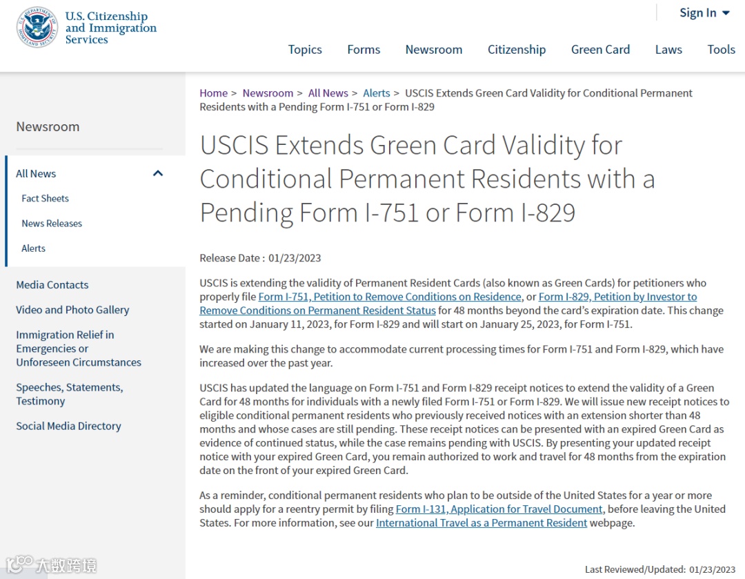 美国移民局1月23日发布消息,将已递交了I-751(婚姻移民临时绿卡更换永久绿卡申请)或I-829(投资移民临时绿卡更换永久绿卡申请)的申请人的临时绿卡有效期延长至48个月。I-829申请自2023年1月11日生效,I-751申请自2023年1月25日生效。