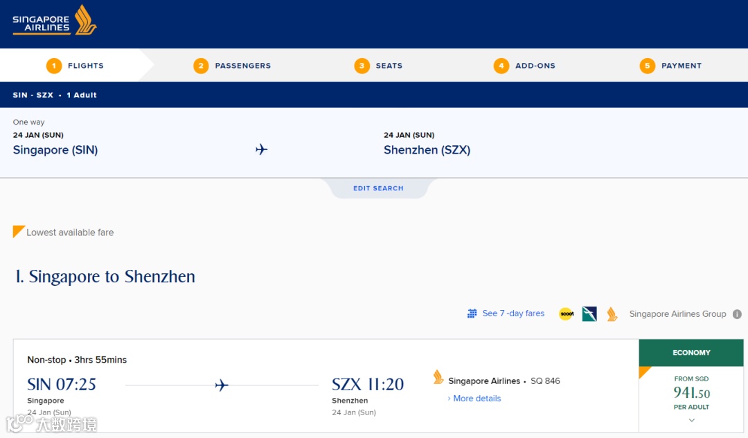 单程经济舱低至S$941.5