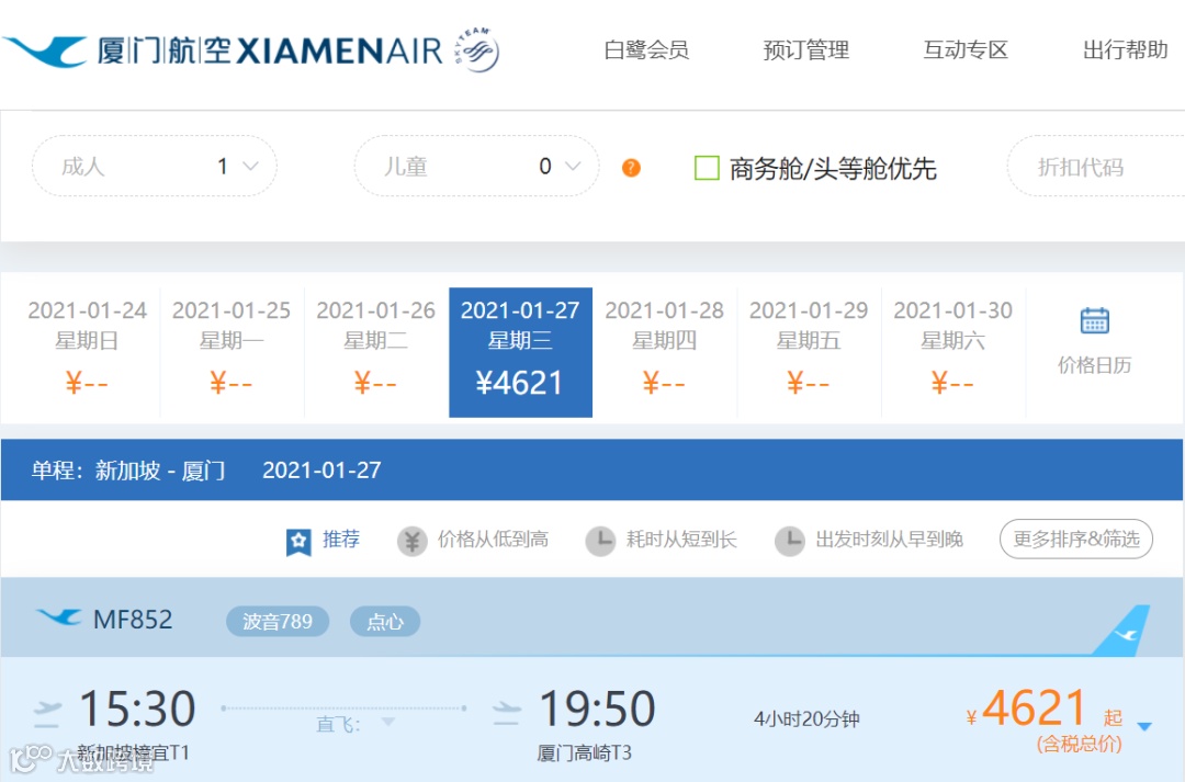 厦门航空 1月27日