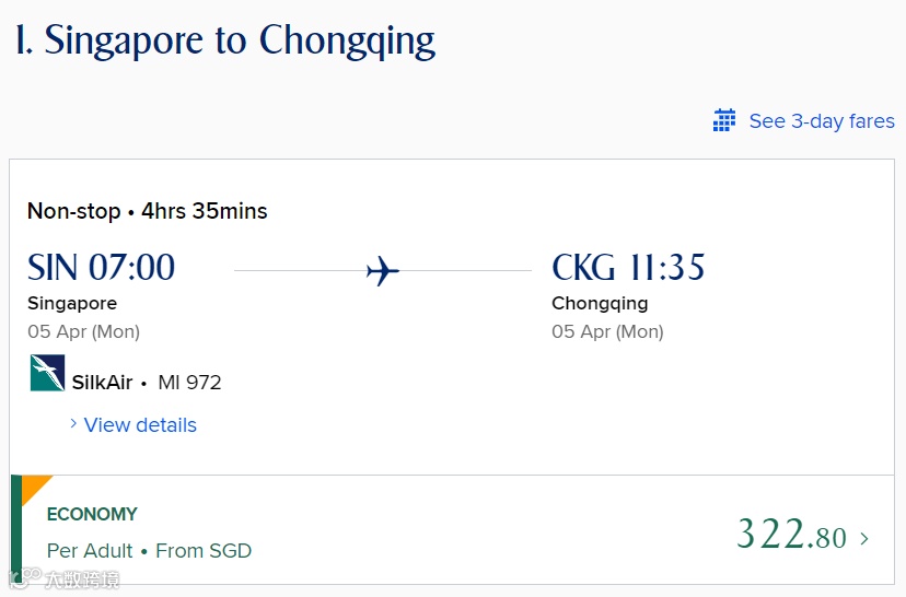 单程经济舱低至S$322.8