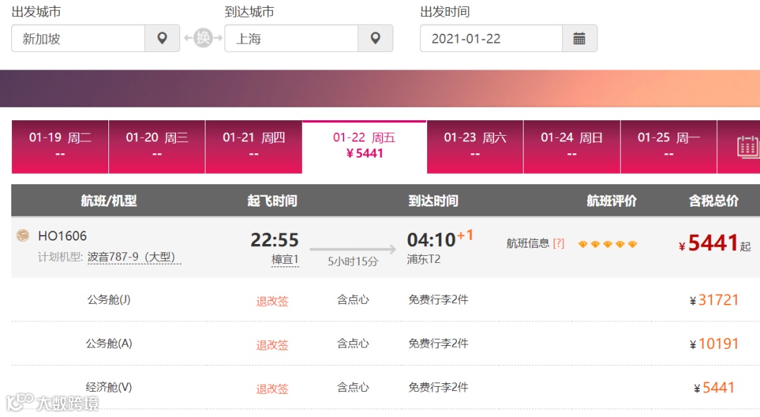 单程经济舱低至¥5441