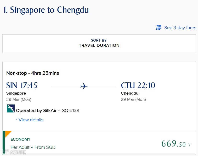 单程经济舱低至S$669.5
