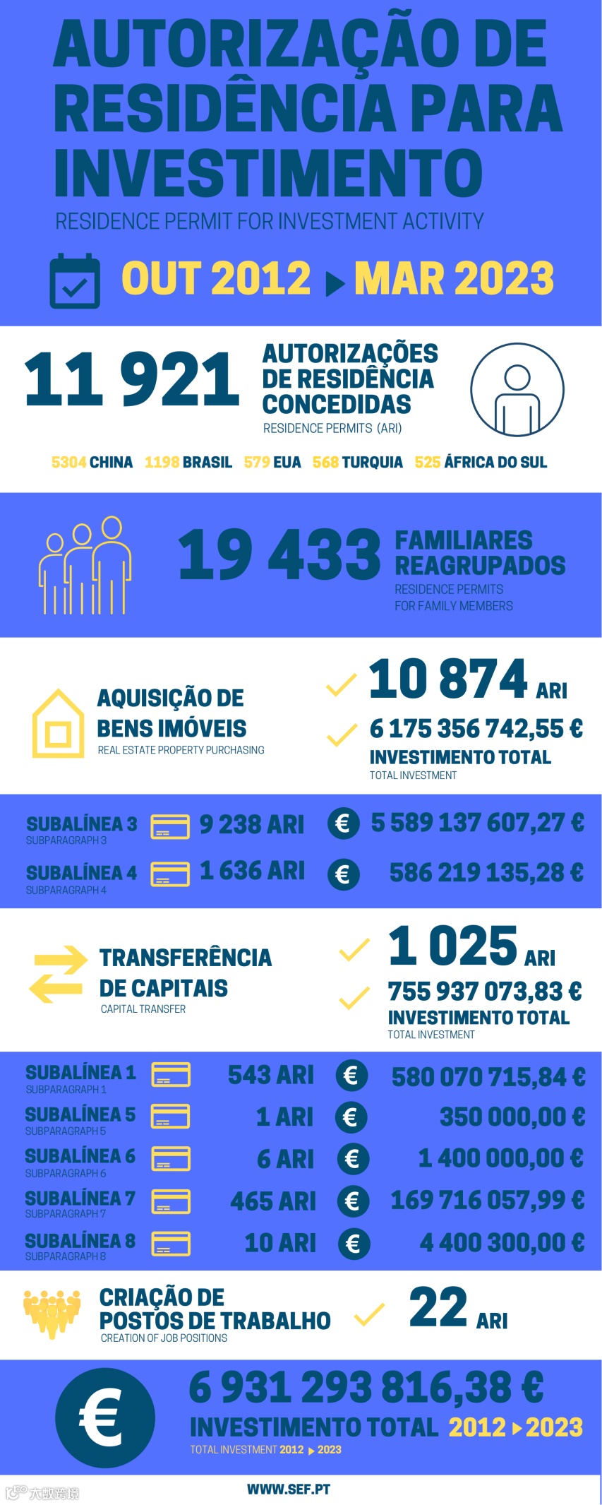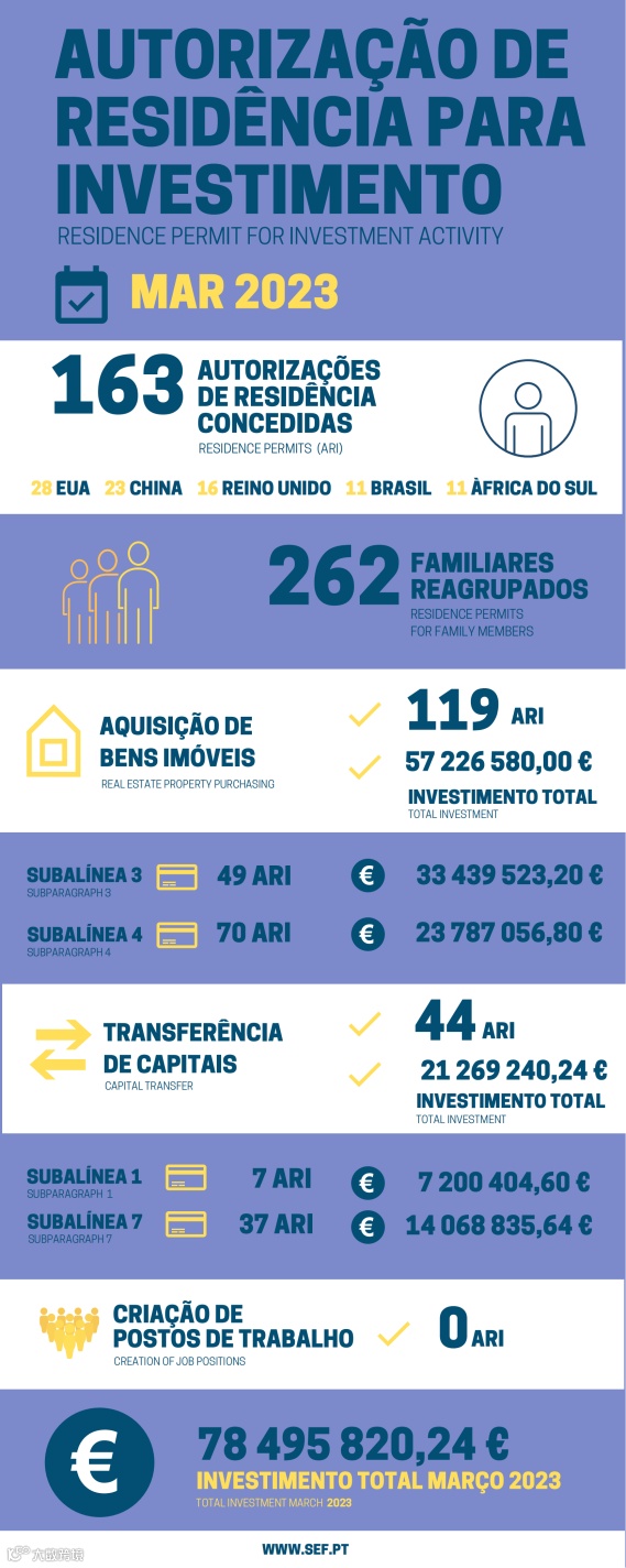 葡萄牙移民局(SEF)公布了新的黄金签证数据:2023年3月共有163位主申请人和262位附属申请人获批葡萄牙黄金签证。