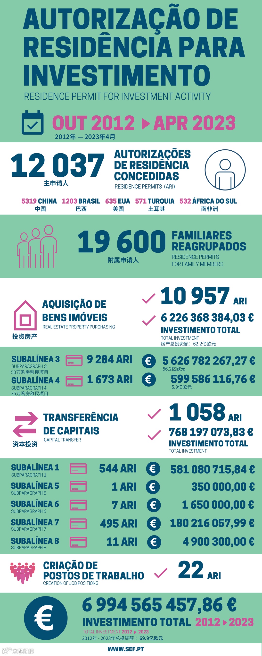 葡萄牙移民局也再次更新了2012年10月黄金居留政策推行以来的整体数据。数据显示:自2012年10月葡萄牙黄金居留计划推出至2023年4月底,已有12,037位主申请人获批葡萄牙黄金签证,获批附属申请人19,600位。