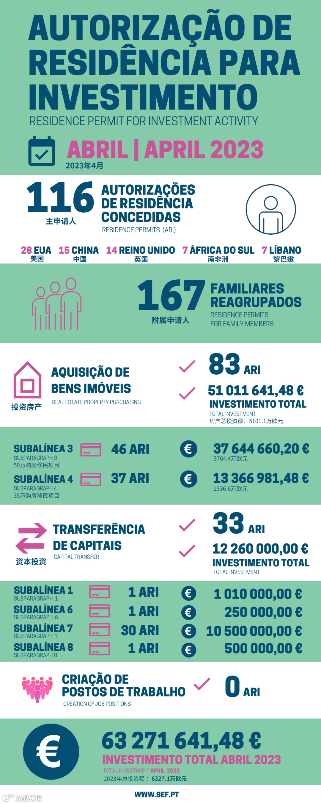 日前,葡萄牙移民局(SEF)公布了2023年4月的黄金居留签证申请数据:在2023年4月,共计有116位主申请人和167位附属申请获批葡萄牙黄金签证,获批总人数为283人,总投资额约6327万欧元。