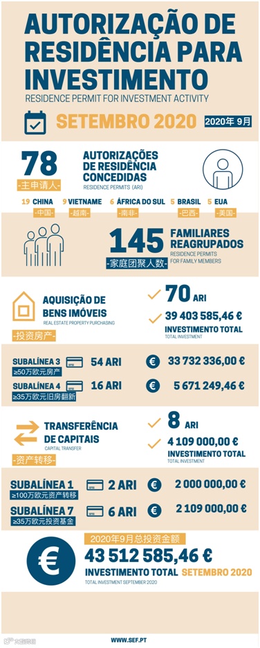 近日,葡萄牙移民局公布了最新黄金签证数据:2020年9月共有78位主申请人和145位附属申请人获批葡萄牙黄金签证,投资额为4351万欧元。
