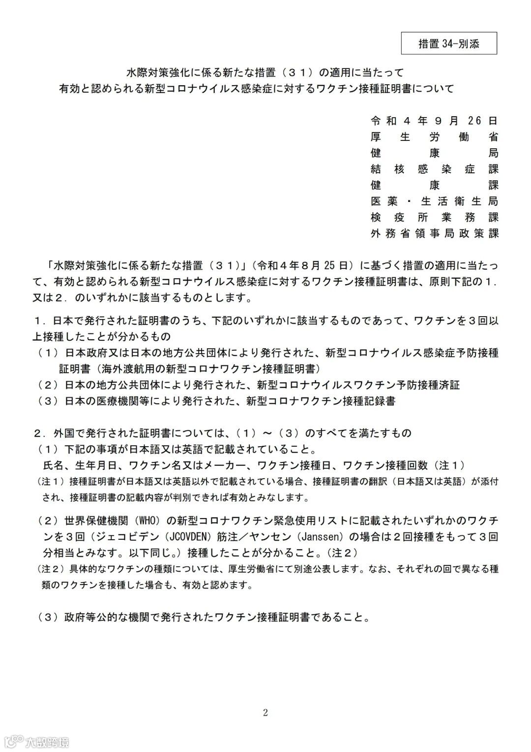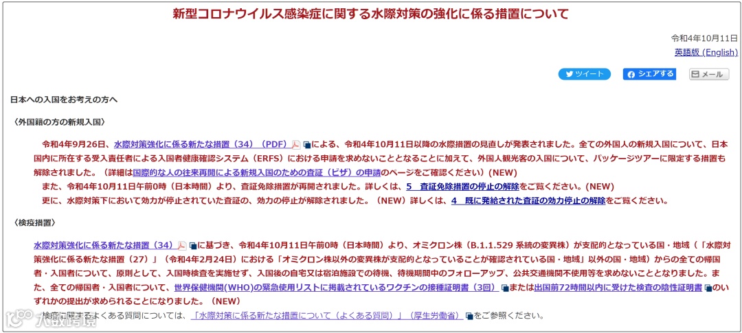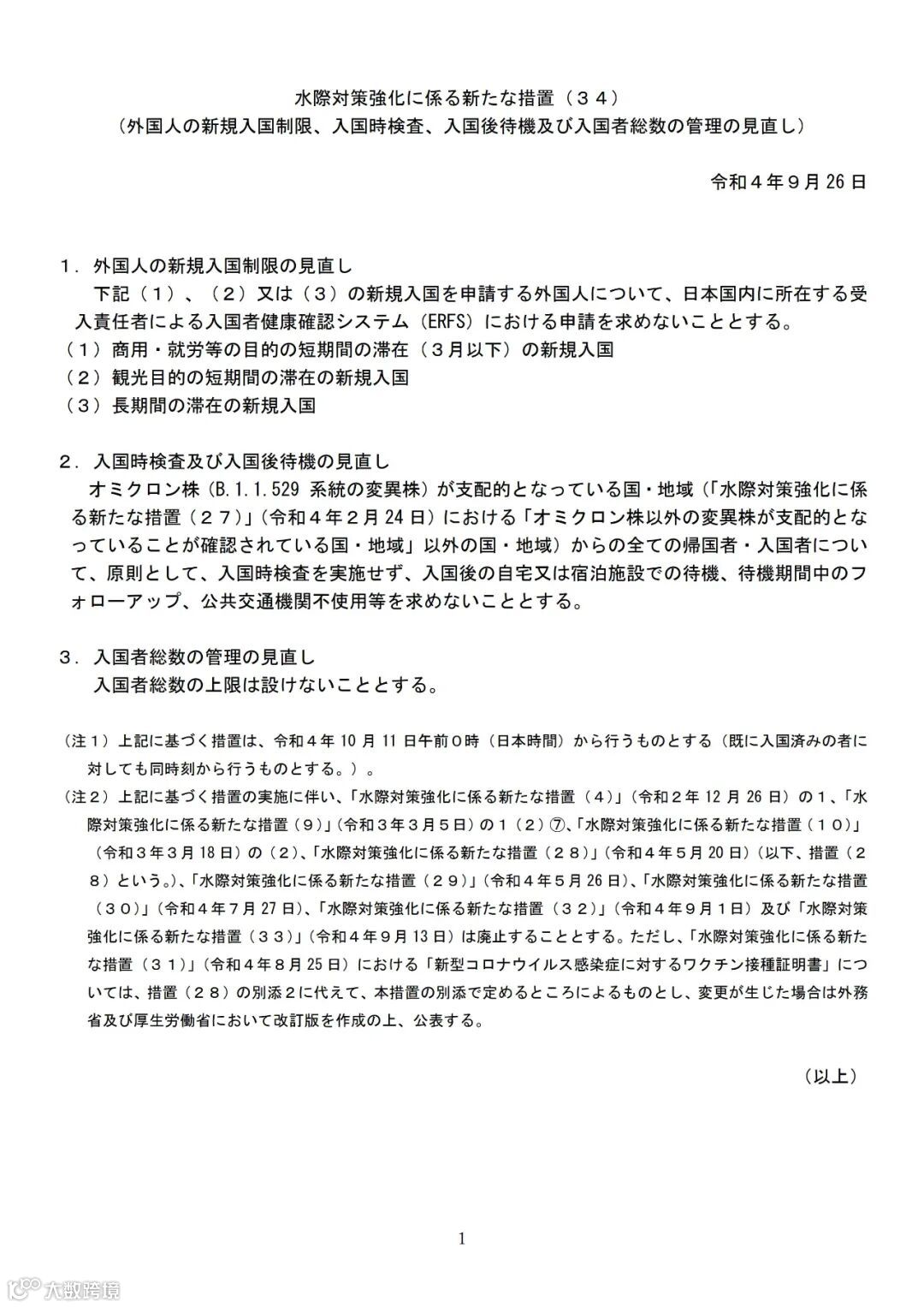 2022年10月11日0时(日本时间)开始,对“(防疫对策强化新措施(34)(PDF)”中外国人新规入境限制的相关内容做出调整,关于签证申请等新措施详情如下。