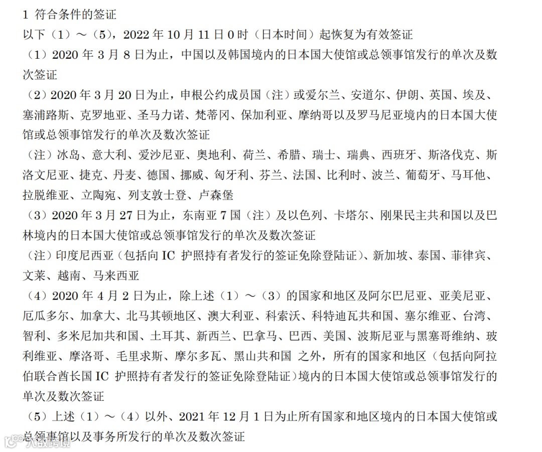 2021年12月2日前发行的签证均暂时失效,自2022年10月11日0时(日本时间)以后,恢复以上签证效力。