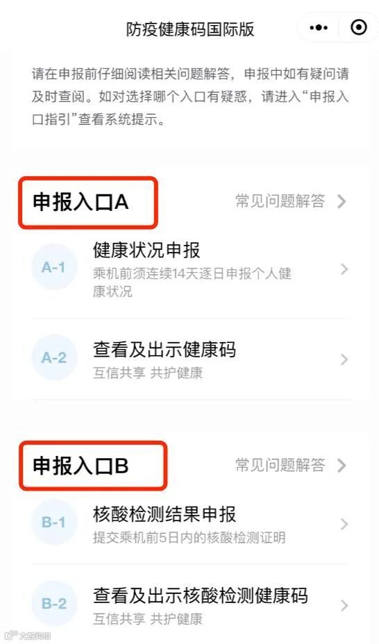 第三步:待查好要申报的入口,改版后的健康码国际版变成AB两个申报入口,与原来类似的是 申报入口A ,而需要上传核酸检测报告的是 申报入口B 。