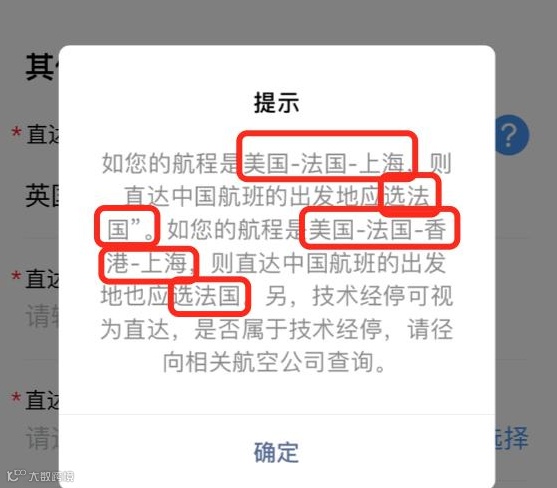 在填写 直达中国航班的出发地 这一栏时,要填写 最后一次的转机入境中国地 ,而不是起飞地。
