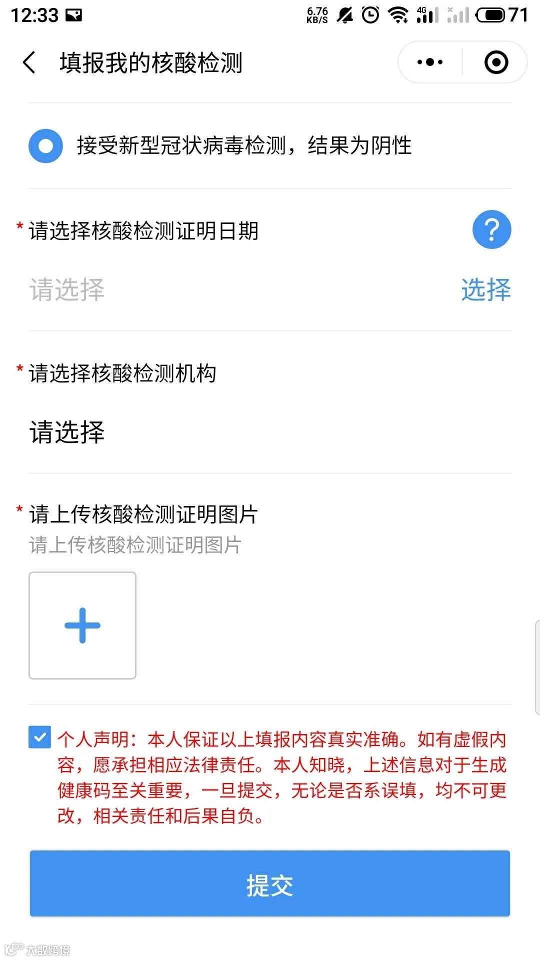 而申报入口B,作为核酸检测结果的上传端口, 大家注意拍照的时候需要清晰。