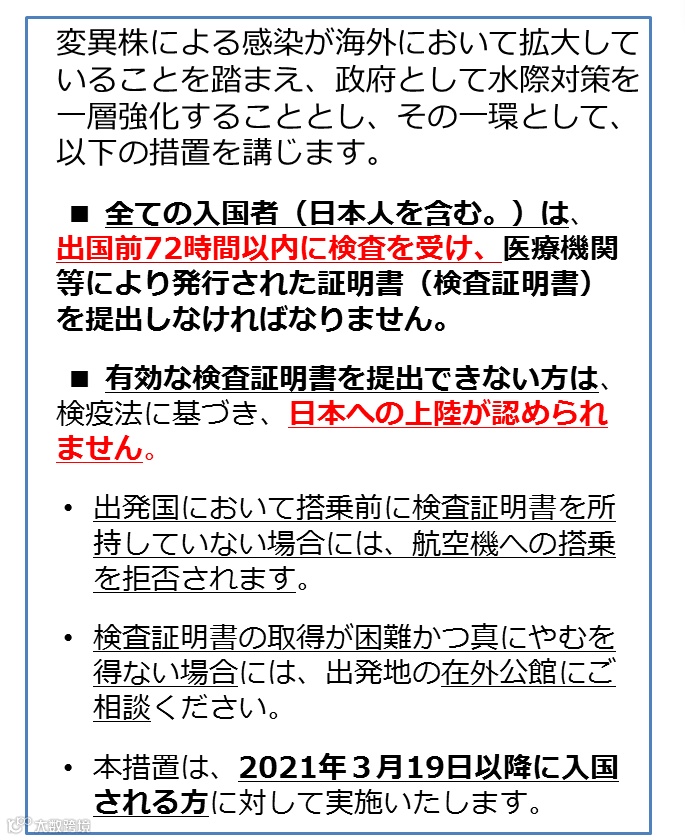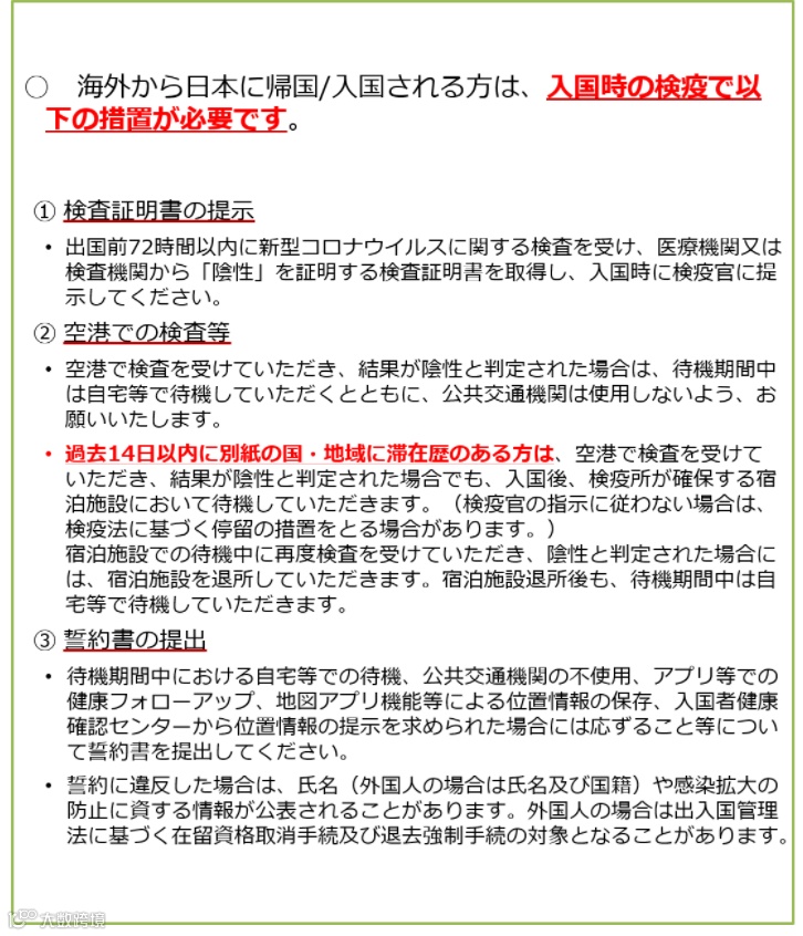 需要提交一份出国前72小时内的新冠检测结果证明书,如果你不能提供这个证明,根据检疫法,你将不被允许在日本登陆。