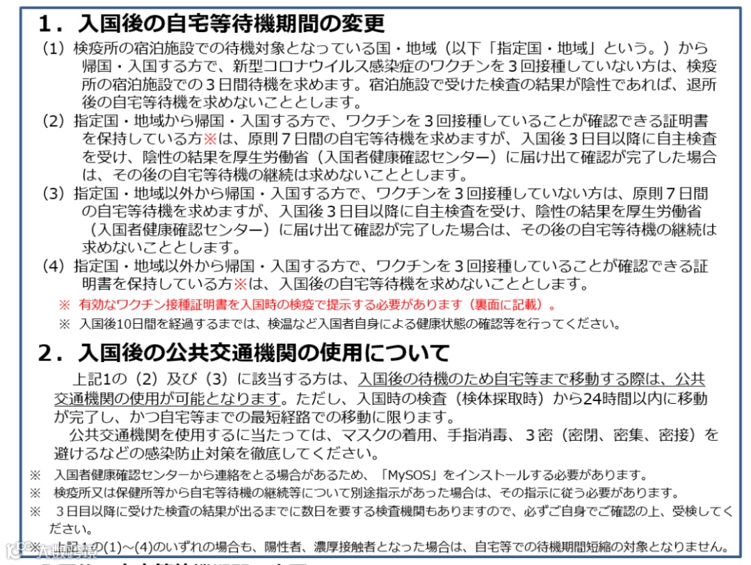 来自新冠流行国家和地区的入境者,如果已经接种完第3针疫苗,原则上需要居家隔离7天,不过如果自我隔离3天后主动进行新冠检测呈阴性,并上报厚生劳动省得到认可的场合,则可以恢复自由无需隔离。