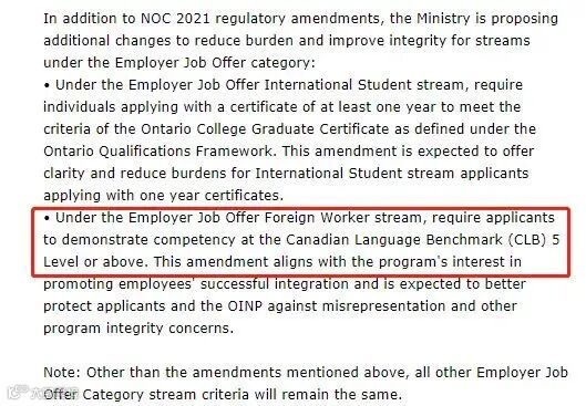 除此之外,新的修正提案还特别提到将对“技术移民雇主聘书类别”(Foreign Woker with Job Offer Stream)设置最低语言标准:CLB5!