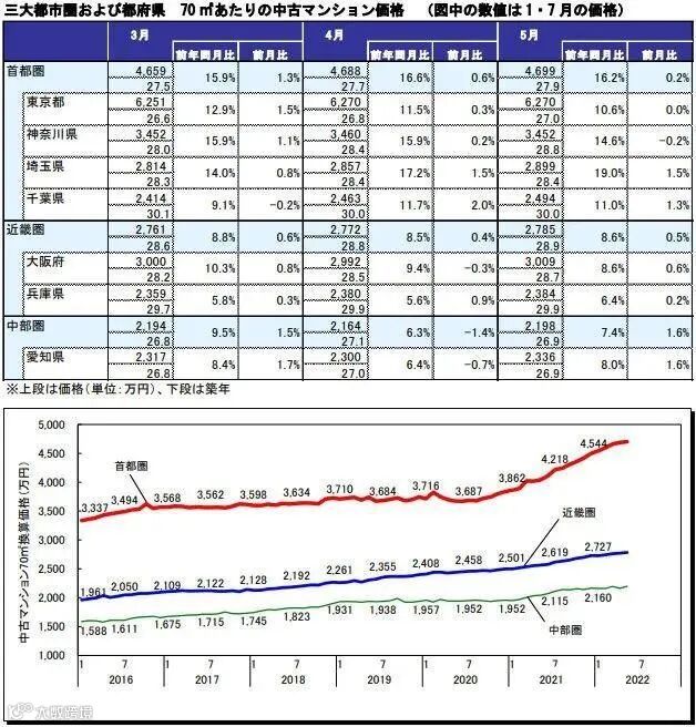 下面,再来为大家介绍一下日本最新的房产发展动向。日本的房地产调查公司东京KANTEI(位于东京品川区)发布的数据显示,5月首都圈(东京都、神奈川县、埼玉县、千叶县)二手房平均期望出售价格(按70平方米计算)比上月上涨了11万日元(0.2%),达到4,699万日元。