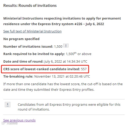 2022年7月6日,联邦快速通道第226轮邀请,本轮针对全类别,1500人获邀最低邀请分数....557分!!!
