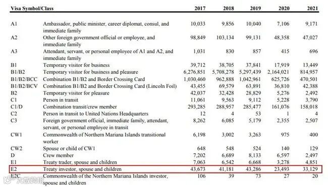 2021财年里,美国总计发放了约279万张非移民签证,比上一财年少了30%,其中美国E-2签证的获批数量是33129张,比上一财年多了近10000张,增长40%。