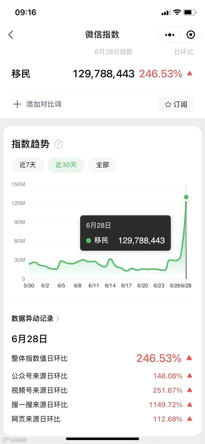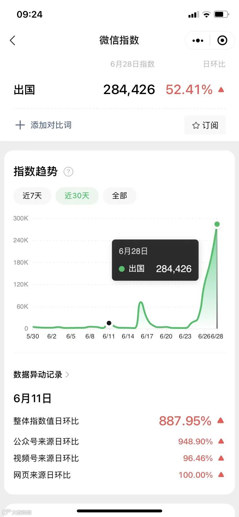 除此之外,近日搜索量上涨的关键词还有“移民”、“出国”!根据28日微信指数,“移民”关键词热度日环比增长246.53%,“出国”关键词热度日环比增长52.41%。