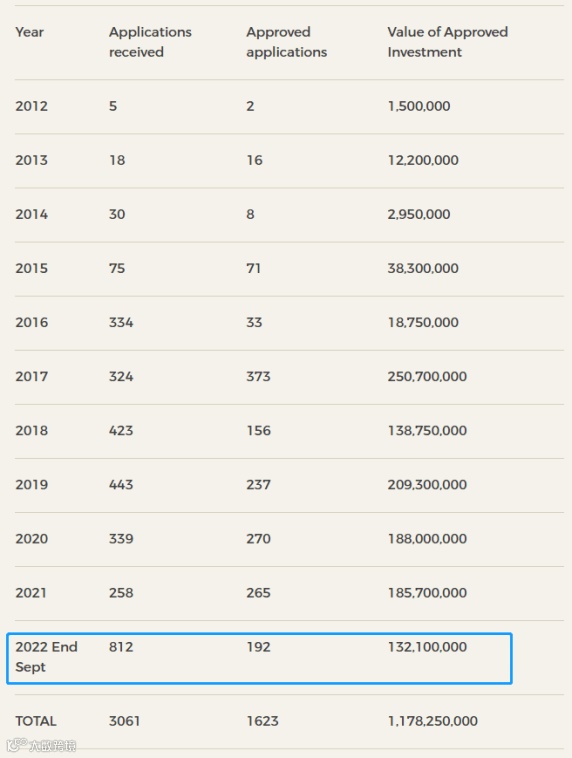 回到此次最新的投资移民申请数据,截止至今年9月底,爱尔兰投资移民计划获批量总累计为1613个家庭,累计为爱尔兰提供了11.8亿欧元的投资金额;其中2022年1-9月,812份的申请共有192份申请成功获批,为爱尔兰带来了1.32亿欧元投资。