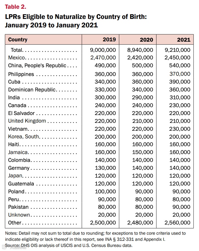 美国DHS国土安全部发布了一份最新版美国绿卡人口数据报告,这份报告显示截止到2021年1月1日,美国共有1310万绿卡持有者生活在美国境内,这比2020年同期下降了1.8%,其中有920万绿卡持有者已经符合申请美国公民的标准。