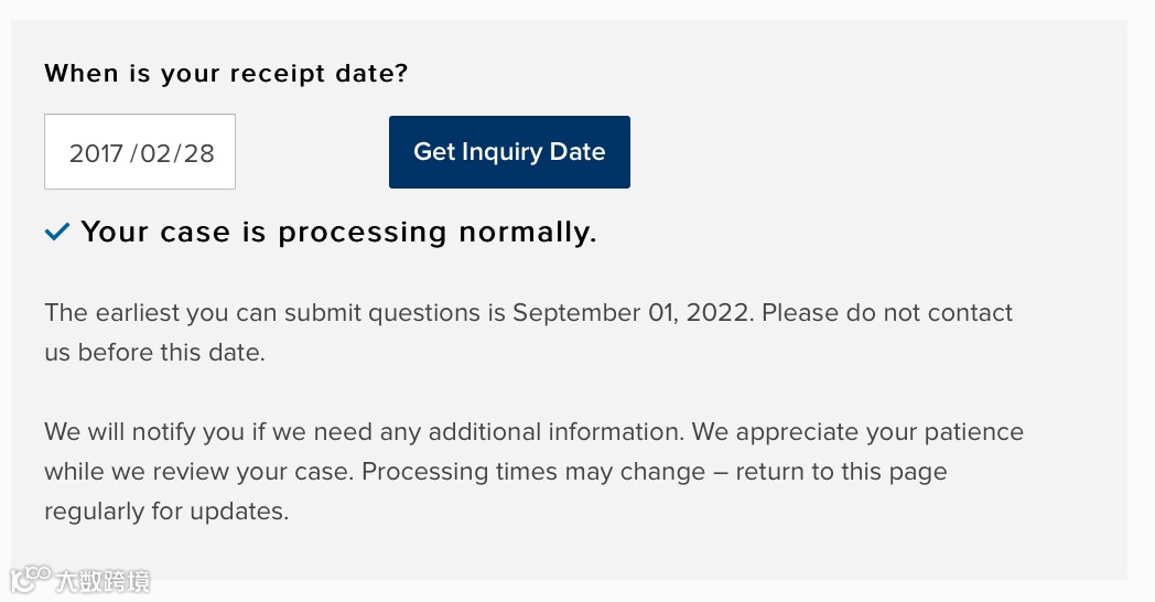需要注意的是,以上所说的审批所需的预计时间范围,是从收到递交的日期开始,移民局处理案子所需的时间。这个时间范围是移民局根据已完成案子的历史数据计算出来的案件处理时间,并不能预测当前案件的审批时间。如果申请人的审案时间已超出移民局公布的审案时间跨度范围,可以在