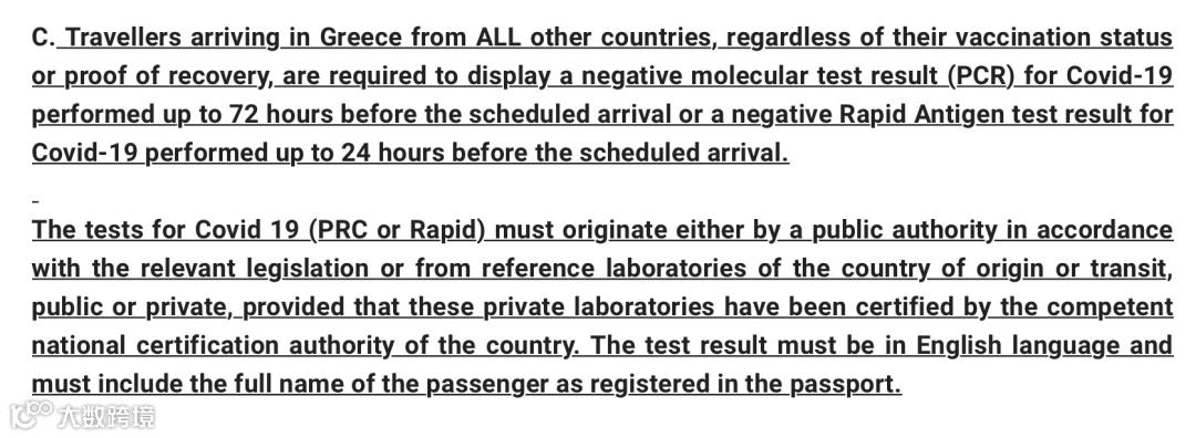 在抵达希腊前72小时内进行新冠病毒核酸检测,或到达前 24 小时进行新冠病毒抗原检测为阴性的检测证明。