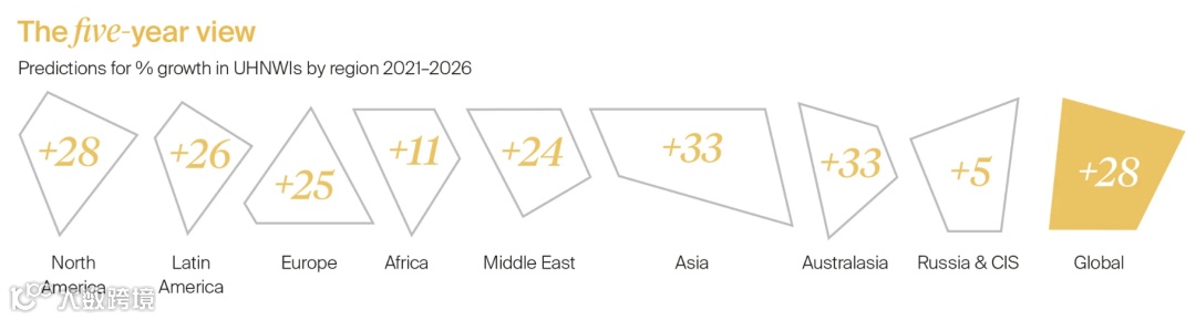 展望未来,由于83%的受访者预计他们客户的财富今年将进一步增长,因此Knight Frank预计,高净值人士数量在未来五年还将进一步增长28%。而在截至2026年的十年间,全球超高净值人士的数量将翻一番——从348,355人增加到783,671人。