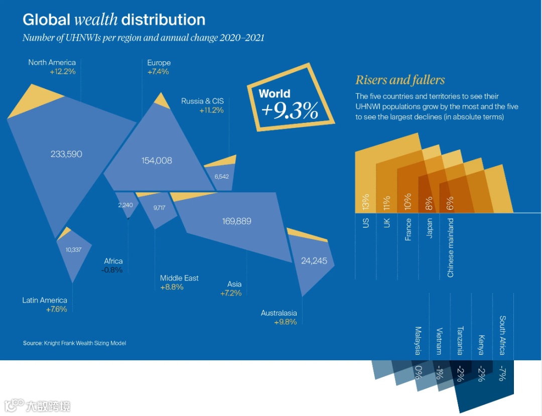 Knight Frank的数据分析显示,全球超高净值人士的数量在2020年增长2.4%之后,在2021年大幅增长了9.3%,新增了5.2万名非常富有的人,这使得超高净值人士数量增加至610,569人。