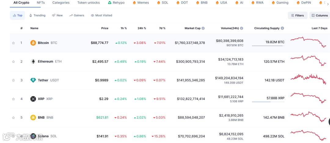 截至2月26日,比特币价格下跌7.01%,至88,774美元,而以太坊价格则下跌7.44%,至2,495美元,创下自2024年10月以来的最低水平。