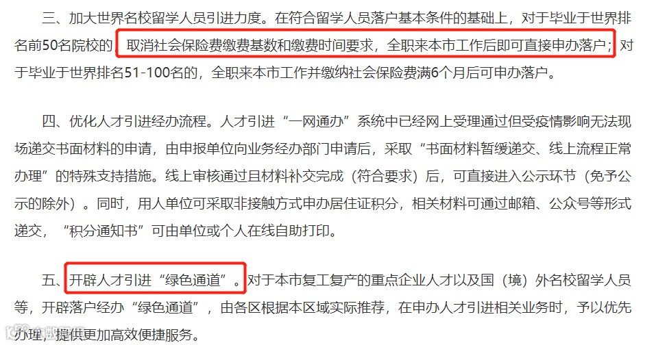 ③ 针对世界排名51-100名的学校毕业留学生,也是有一定的条件放宽,只要全职来本市工作并缴纳社保满6个月后可直接申办落户上海,取消了必须满足一倍社保基数的要求!