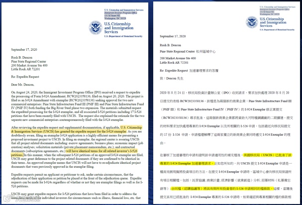 USCIS美国移民局已经批准了BRS 二期项目的加速审理申请(满足国家重大利益项目),项目的I-924模范样板,以及使用相同文档的I-526申请都将获得加速审理。
