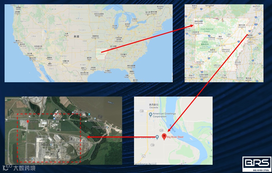 水路交通发达,紧邻密西西比河,沿河而上可以到达五大湖工业区,沿河而下可以直接到墨西哥湾出海。 公路交通发达,紧靠61、55号公路,相连14、140、181号公路,公路网密集,到美国东西布距离相近。 拥有自己专用铁路线,巴菲特麾下BNSF铁路公司为BRS投资建设了专用铁路,并利用BNSF全美第二大铁路公司的战略合作,可以将产品迅速运往全美各地。 对岸紧靠航空中心孟菲斯,孟菲斯机场是全球第二大货运机场 紧邻生产原料产地,全美三大废钢企业都在附近,可以很方便的获得生产原料
