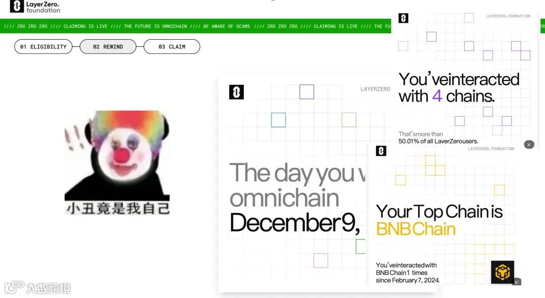 在领取ZERO前,页面会给你做一个类似国内互联网公司经常用到的年度回顾栏目,赫然写着“你于X日第一次使用omnichain”、“你交互了X次”等温情的回顾,仿佛让你回想起之前努力交互等待良好预期的艰苦岁月。
