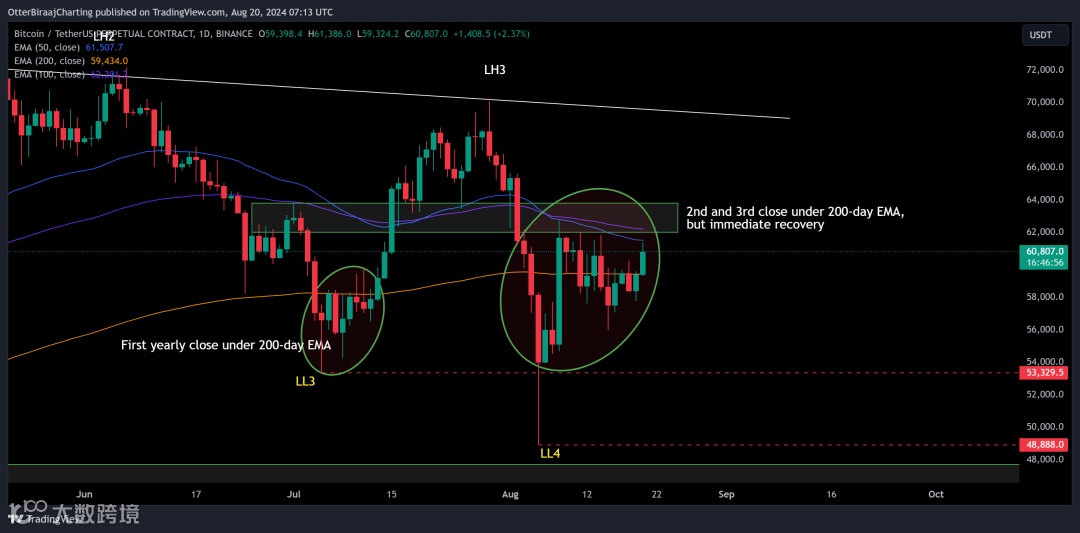2024年,比特币价格仅三次收于200日指数移动平均线(EMA)下方。