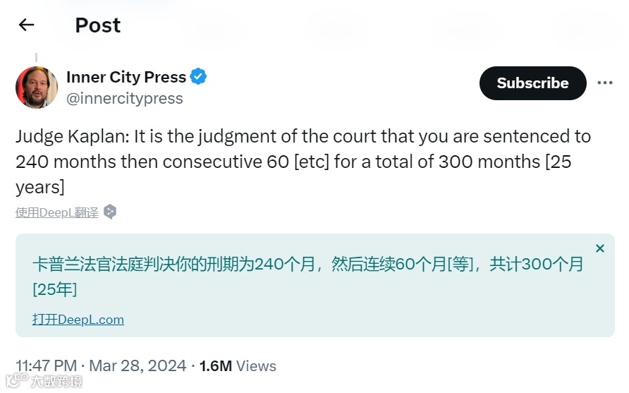 3月28日,FTX创始人SBF因数十亿美元欺诈在纽约被判20年监禁,并随后更新为25年。