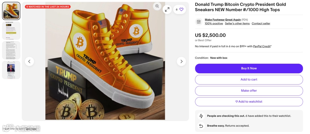 此外,除了“比特币橙色”高帮鞋外,特朗普团队还计划推出橙色低帮鞋和黑色高帮鞋,这些鞋子同样限量发售1000双,目前仍在预售中,售价299美元。