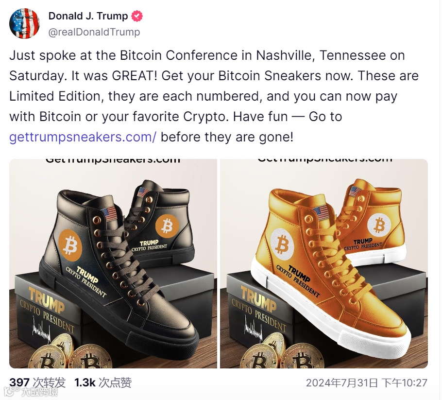 7月31日,特朗普在Truth Social平台宣布推出支持比特币或其他加密货币支付的限量版运动鞋,鞋身印刷有“Trump,Crypto President”。