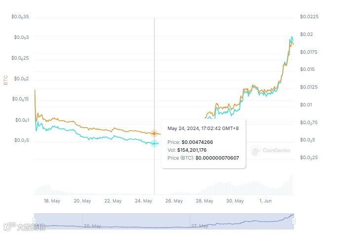 NOT是Telegram上的一款点击游戏,最近其价格一路高歌猛进,据coinmarket上的数据显示,NOT 代币在7天内上涨超过280%。