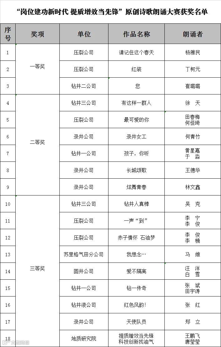 9月4日,由长城钻探公司工会主办、压裂公司承办的"长城钻探公司'岗位建功新时代,提质增效当先锋'第三届原创诗歌朗诵大赛决赛拉开帷幕,共有16个单位80多名选手参加。