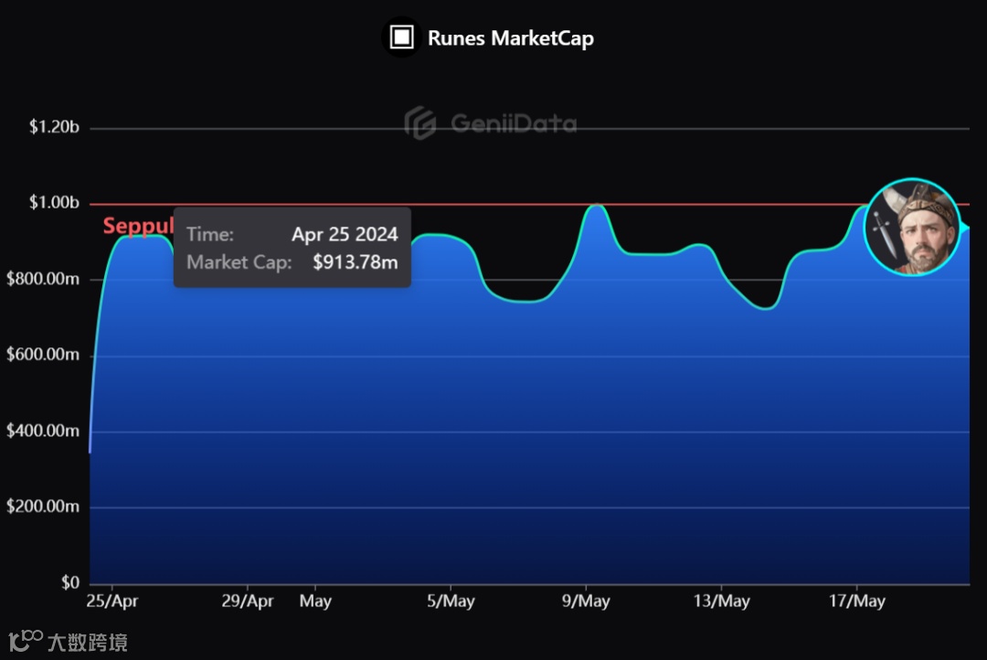而GeniiData数据显示,Runes生态总市值曾于5月9日于当日的均值达到9.986亿美元高点,未触及10亿美元,在5月18日Runes生态总市值曾短时突破10亿美元,而当日全时间段的均值为9.936亿美元。